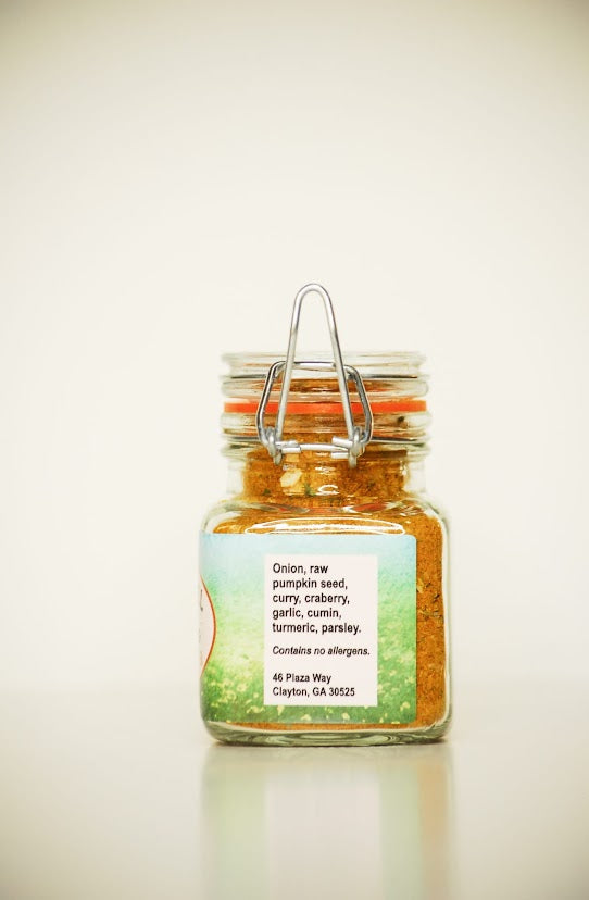 (onion, pumpkin seed, curry powder, dried cranberries, garlic, cumin, turmeric, parsley)